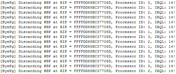 7 Log( "Discarding #BP at RIP = %p, Processor ID: %d, IRQL: %d!\n", ContextRecord->Rip, KeGetCurrentProcessorIndex(), GetProcessorState()->Cr8 );